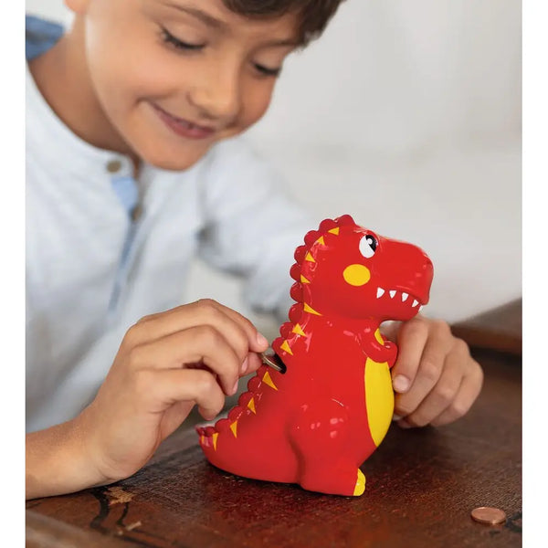 Ο κόκκινος κουμπαράς με κίτρινες λεπτομέρειες δεν είναι μόνο ένα ξεχωριστό " γουρουνάκι" για αποταμίευση, αλλά και μια υπέροχη διακόσμηση για το παιδικό δωμάτιο. Με τη δροσερή συσκευασία δώρου σε στυλ δεινόσαυρου, είναι το ιδανικό δώρο για παιδικά γενέθλια!