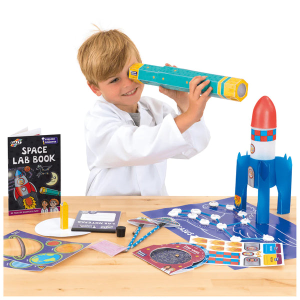 Οι μικροί επιστήμονες μπορούν να φτιάξουν μοντέλα αστερισμών που φωσφορίζουν στο σκοτάδι, να κατασκευάσουν το δικό τους τηλεσκόπιο και να εκτοξεύσουν το δικό τους πύραυλο. Μπορούν να πειραματιστούν με το φαινόμενο της σκιάς, να φτιάξουν διαστημικό slime και να δημιουργήσουν ένα μικρό ηλιακό σύστημα μες το δωμάτιό τους. Στο «Space Lab» περιλαμβάνονται 12 διασκεδαστικά πειράματα. Περιεχόμενα: 22 φωσφορίζοντα αστέρια, 46 φωσφορίζοντες υποδοχείς, 10 καλαμάκια με αστερισμούς, πύραυλο και πτερύγια, κωνική μύτη, ελαστικό πώμα, βαλβίδα, σκόνη δημιουργίας slime, 3 φακοί τηλεσκοπίου, 2 χάρτινα καλαμάκια, κολλώδης τσίχλα, καρφίτσα διαχωρισμού, πλαστικό φύλλο, οδηγός αστερισμών σε μέγεθος Α3, εκτυπωμένες κάρτες, φωσφορίζοντα αυτοκόλλητα πλανητών, φύλλο αυτοκόλλητων, σημειωματάριο κι εγχειρίδιο οδηγιών 24 σελίδων, στην αγγλική γλώσσα.