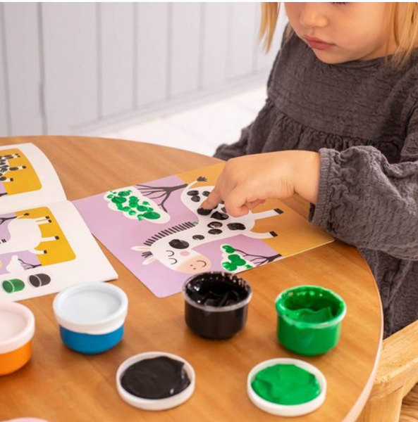 Περιλαμβάνει 6 φύλλα με θέμα τα ζώα, 6 βαζάκια με δακτυλομπογιά, 1 βιβλίο με οδηγίες και παραδείγματα για το πώς να πραγματοποιήσετε τη δραστηριότητα.
