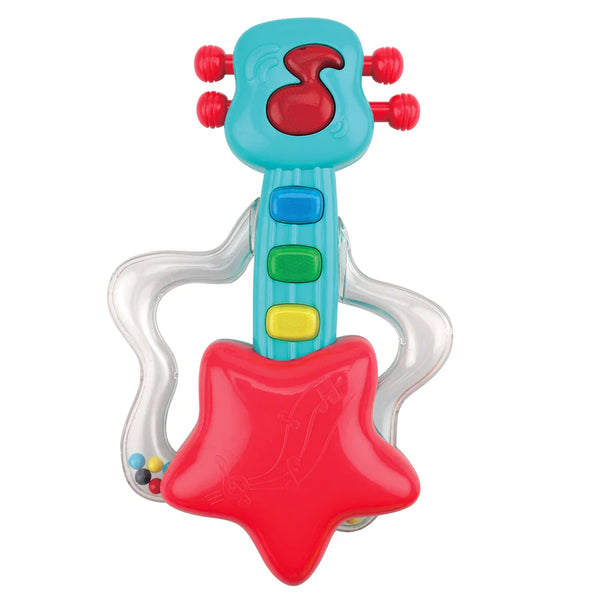 Η Μουσική Κιθάρα Rock Star παίζει 6 διασκεδαστικές μελωδίες με φωτεινά λαμπάκια. Πατήστε το κουμπί στο πάνω μέρος για να εναλλάξετε μεταξύ λειτουργίας μουσικής και λειτουργίας οργάνου. Ανακινήστε τις πολύχρωμες χάντρες για ήχους κουδουνίσματος!