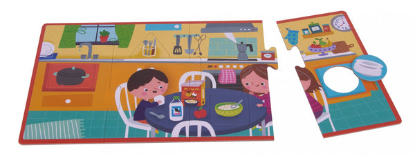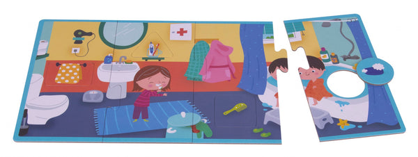 Τα παιδιά πρέπει να στήσουν το παζλ και να αναγνωρίσουν και να αναγνωρίσουν το στοιχείο του στο περιβάλλον του (υπνοδωμάτιο, μπάνιο, κουζίνα και σαλόνι).