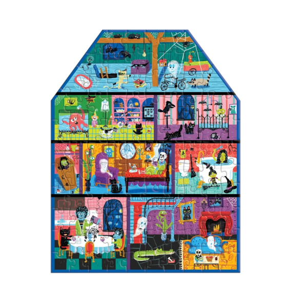 Αυτό το παζλ 100 κομματιών προσφέρει μια διασκεδαστική ματιά σε ένα στοιχειωμένο σπίτι γεμάτο φαντάσματα, τέρατα και αποκριάτικη ατμόσφαιρα.