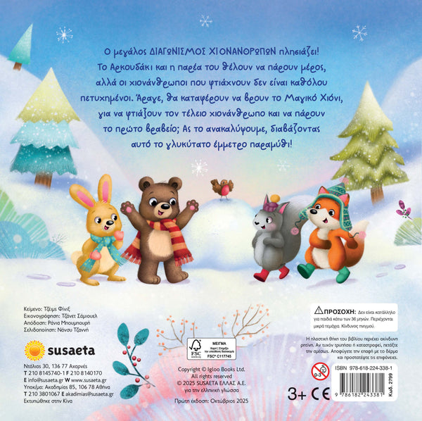 Ο μεγάλος ΔΙΑΓΩΝΙΣΜΟΣ ΧΙΟΝΑΝΘΡΩΠΩΝ πλησιάζει! Το Αρκουδάκι και η παρέα του θέλουν να πάρουν μέρος, αλλά οι χιονάνθρωποι που φτιάχνουν δεν είναι καθόλου πετυχημένοι. Άραγε, θα καταφέρουν να βρουν το Μαγικό Χιόνι, για να φτιάξουν τον τέλειο χιονάνθρωπο και να πάρουν το πρώτο βραβείο; Ας το ανακαλύψουμε, διαβάζοντας αυτό το γλυκύτατο έμμετρο παραμύθι!