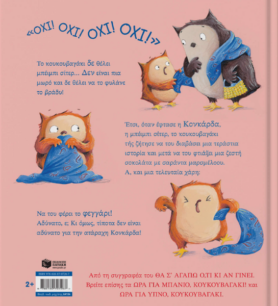Έτσι, όταν έφτασε η Κονκάρδα, η μπέιμπι σίτερ, το κουκουβαγάκι τής ζήτησε να του διαβάσει μια τεράστια ιστορία και μετά να του φτιάξει μια ζεστή σοκολάτα με σαράντα μαρσμέλοου.