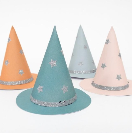 Αυτά τα υπέροχα mini καπελάκια είναι η ιδανική προσθήκη για ένα κομψό και παιχνιδιάρικο Halloween πάρτι! Το σετ περιλαμβάνει 8 καπέλα σε διαφορετικά παστέλ χρώματα, διακοσμημένα με αστεράκια και περίγραμμα από οικολογική ασημί γκλίτερ.