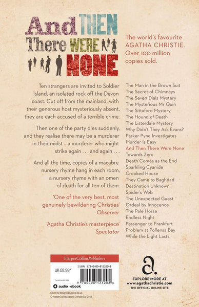 Agatha Christie's world-famous mystery thriller, reissued with a striking new cover designed to appeal to the latest generation of Agatha Christie fans and book lovers. Ten strangers, apparently with little in common, are lured to an island mansion off the coast of Devon by the mysterious U.N.Owen. Over dinner, a record begins to play, and the voice of an unseen host accuses each person of hiding a guilty secret. That evening, former reckless driver Tony Marston is found murdered by a deadly dose of cyanide.The tension escalates as the survivors realise the killer is not only among them but is preparing to strike again... and again...